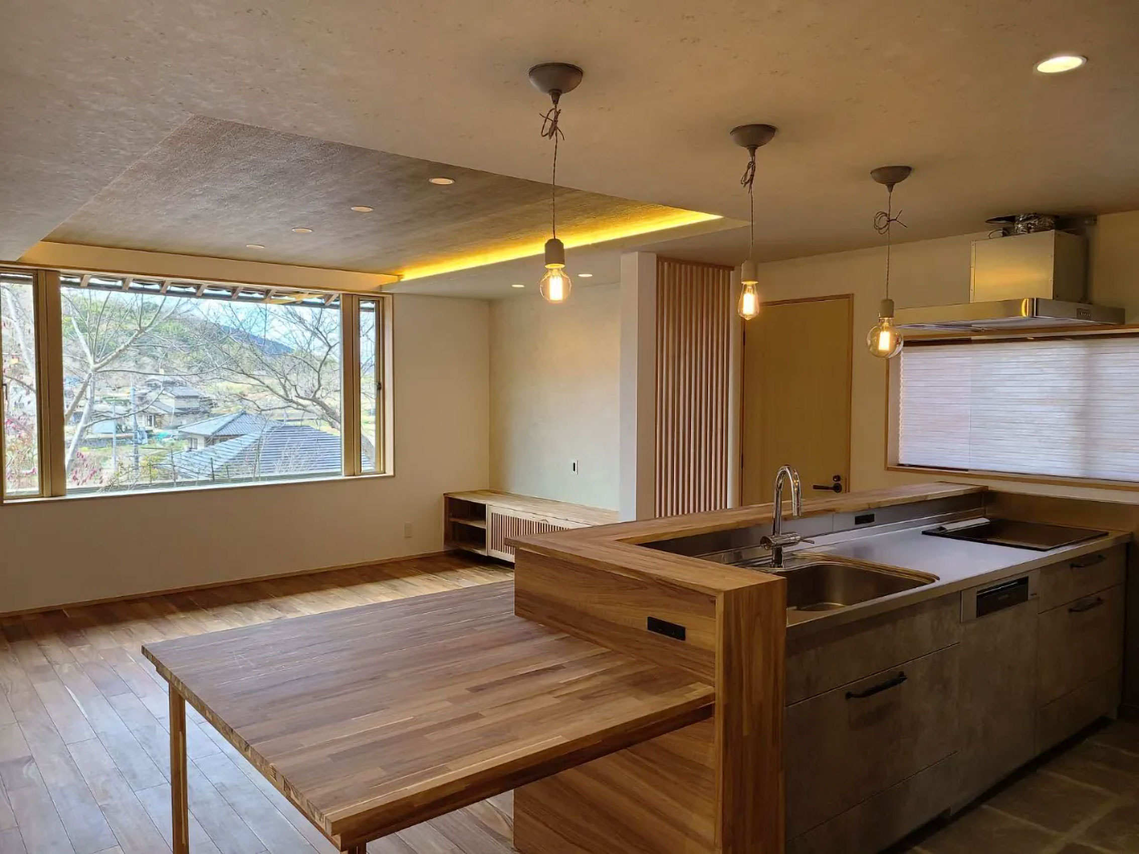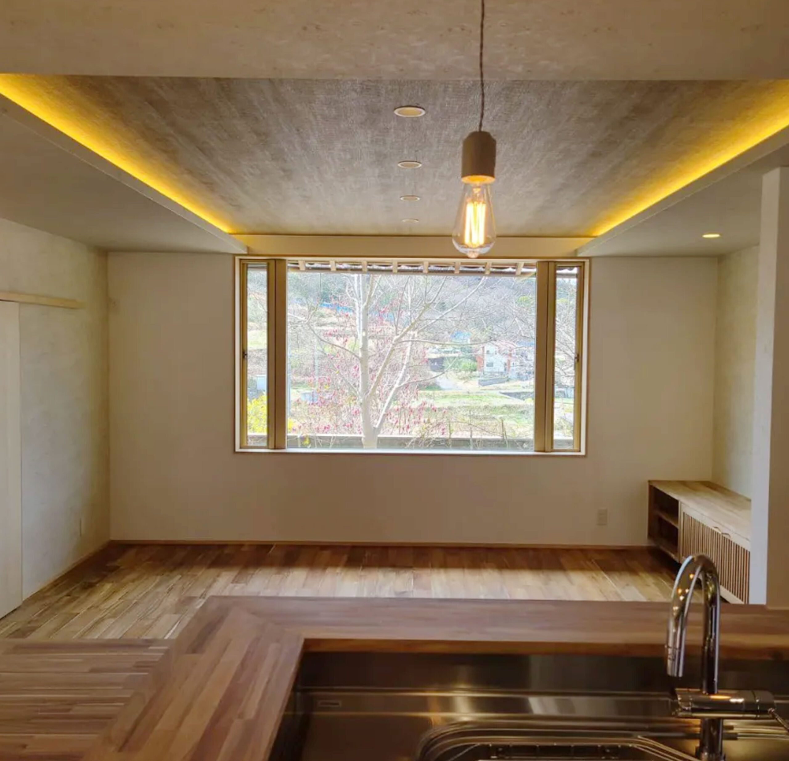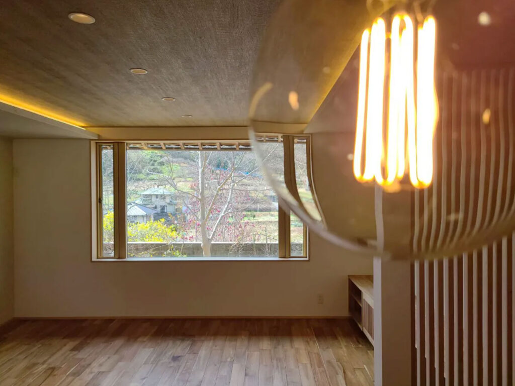 昔子供部屋として使っていた離れに家族で住むためリノベ。少し小高い位置にあり、窓からは四季折々の風景が臨めます。